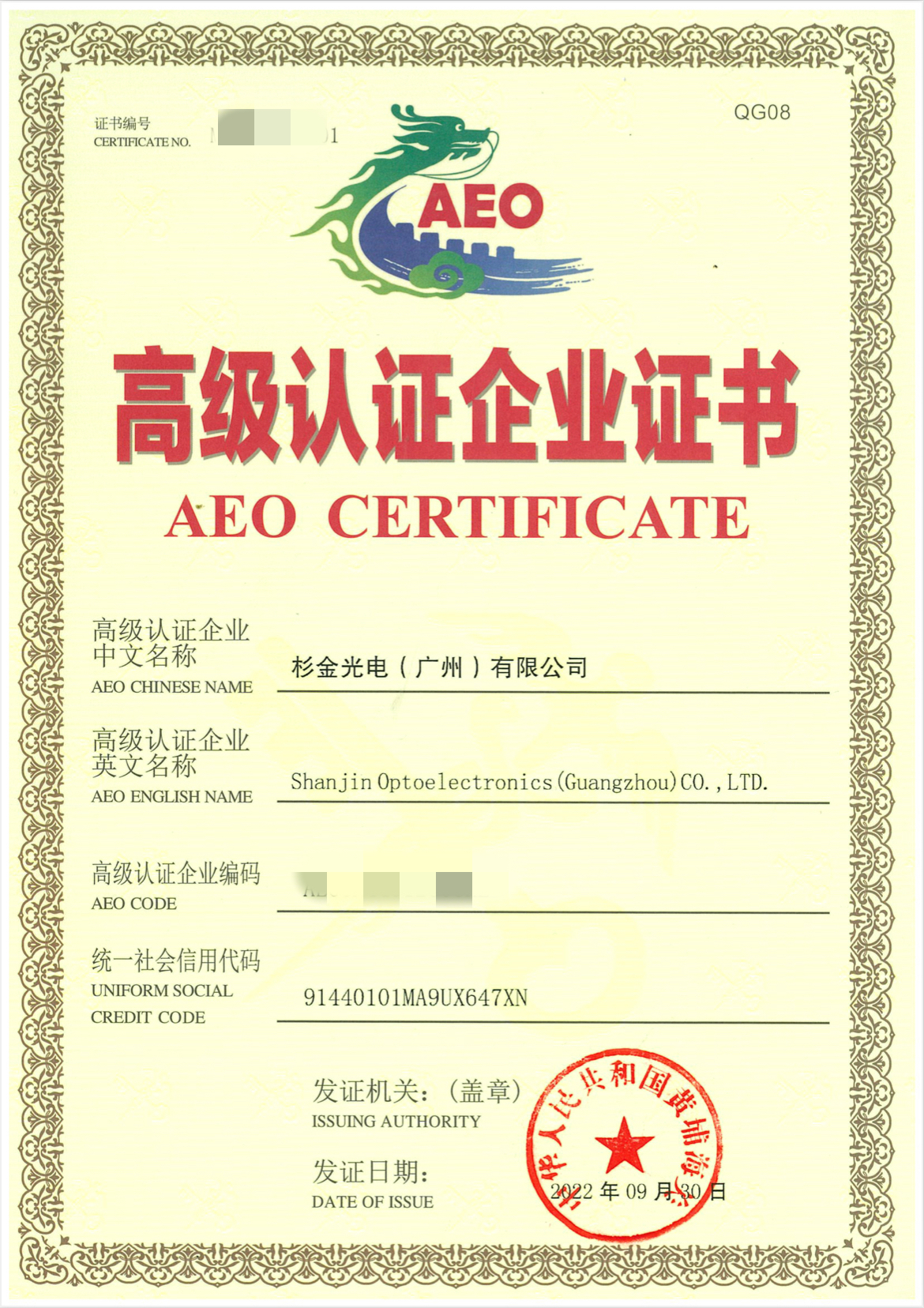 杉金广州获得AEO高级认证企业证书! 2022年10月17日 10月上旬,中国海关企业进出口信用信息公示平台上,杉金广州的信用等级从“注册登记和备案企业”升级为“高级认证企业”。