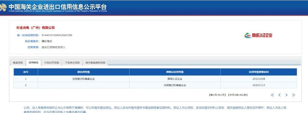 10月上旬,中国海关企业进出口信用信息公示平台上,杉金广州的信用等级从“注册登记和备案企业”升级为“高级认证企业”。